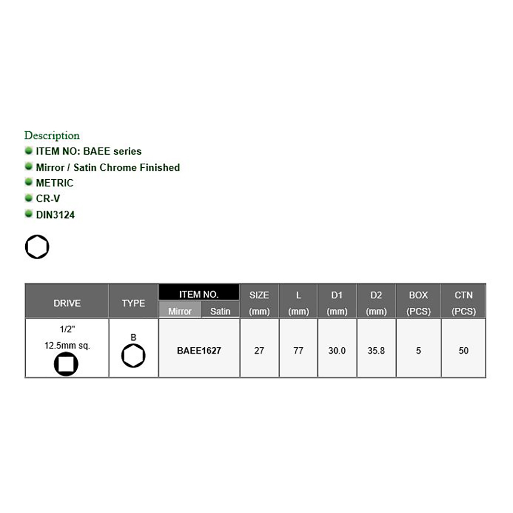 Toptul 1/2 x 27 mm 6 pt. DR. Deep Socket Satin Chrom