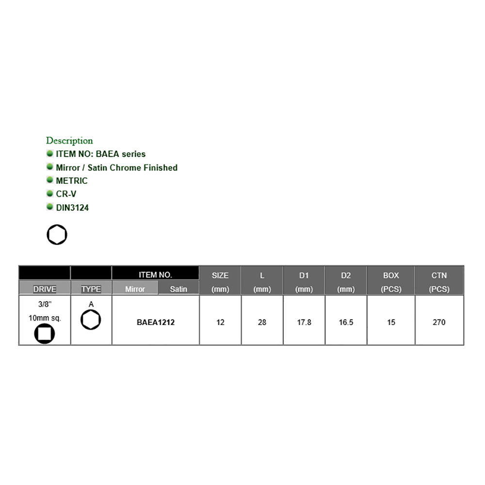Toptul 3/8 x 12 mm Hand SocketL=28 Dr. 6PT