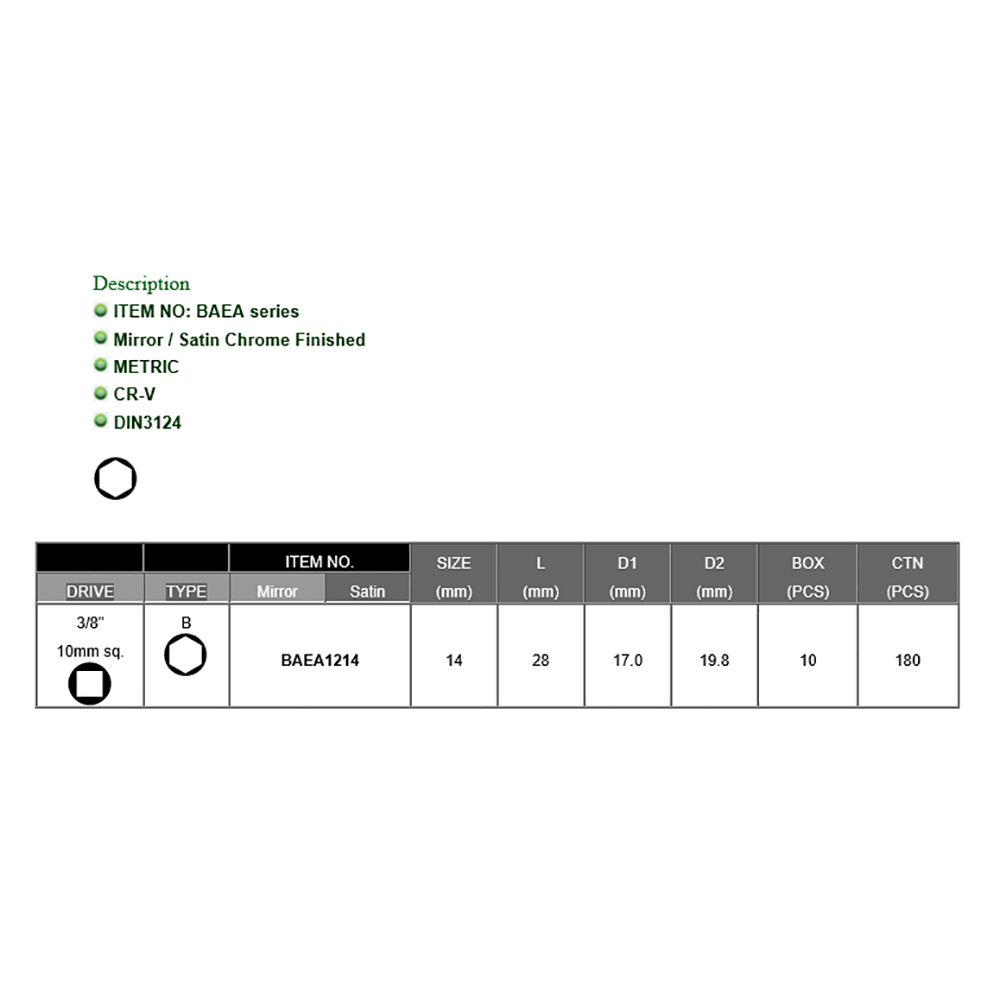Toptul 3/8 x 14 mm Hand SocketL=28 Dr. 6PT