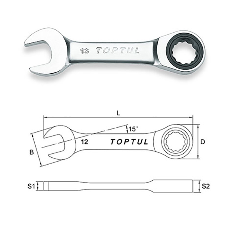 Toptul 8 mm Stubby Ratchet Combination Wrench Satin Chrome Stamping