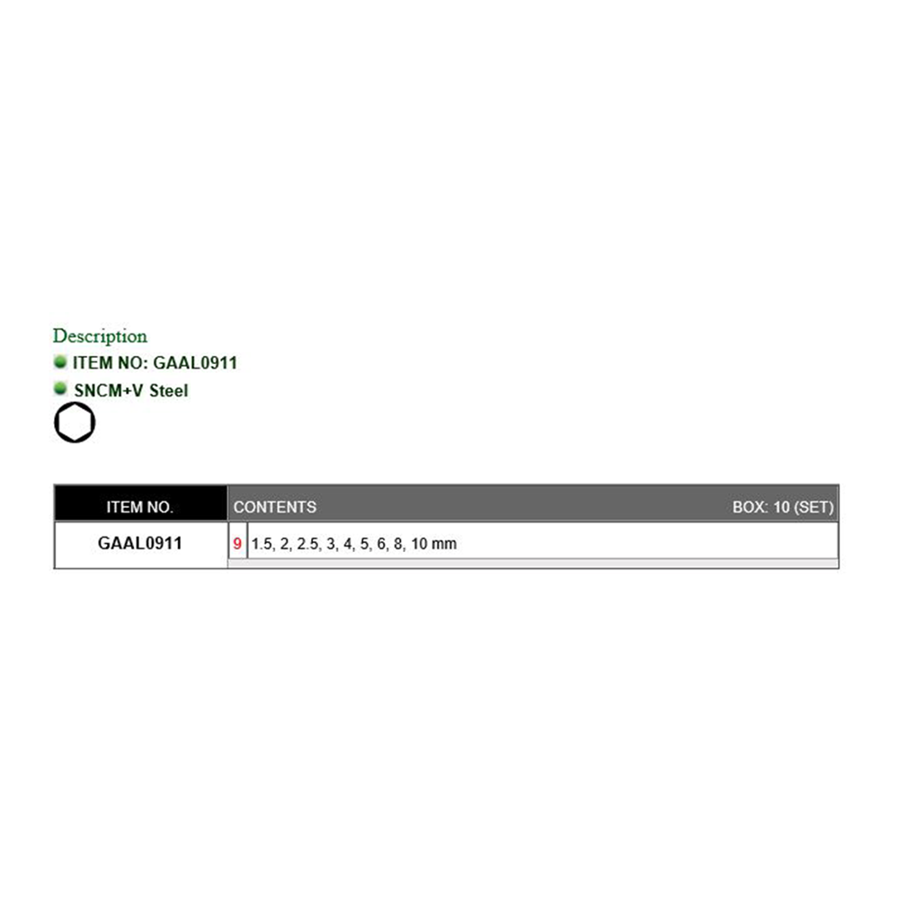 Toptul 9Pcs Long Type Hex Key Wrench Set