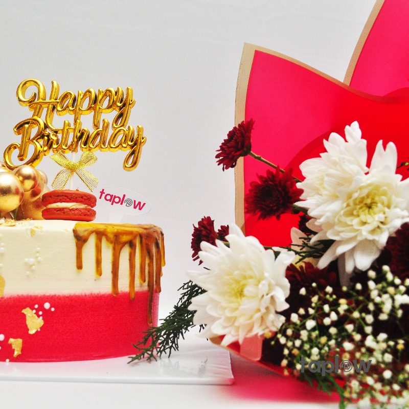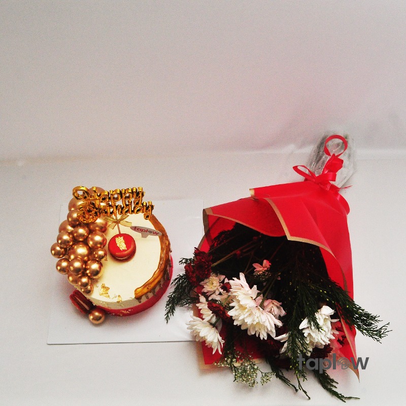 Introducing the Elegance in Red & Gold Gift Set, a stunning combination that embodies sophistication and festive cheer. This exquisite set features a beautifully crafted red and gold cake, rich in flavor and adorned with shimmering gold accents, perfect for any celebration. Accompanying the cake is a vibrant bouquet of fresh flowers, showcasing deep red blooms and golden foliage, adding a touch of natural beauty to your gift. Ideal for birthdays, anniversaries, or holiday gatherings, this gift set is sure to impress and delight, making every occasion truly special.