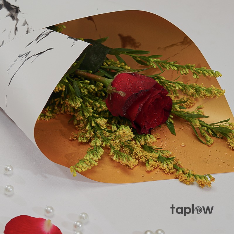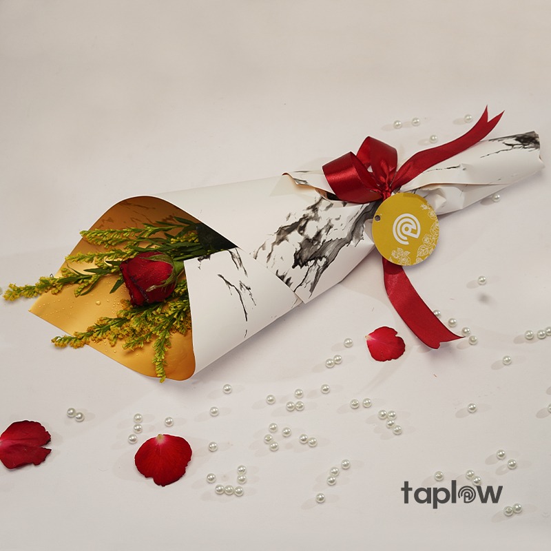 A timeless gesture of love and warmth, the Golden Rose Bouquet features a single, stunning red rose paired with delicate goldenrods. Wrapped in elegant white marble paper with a touch of gold inside, this bouquet is a graceful expression of affection, perfect for meaningful moments and heartfelt surprises.