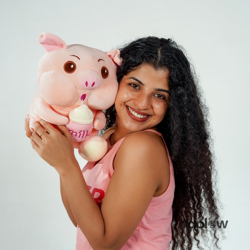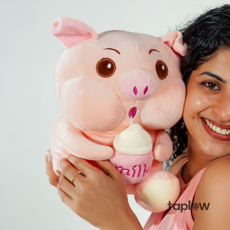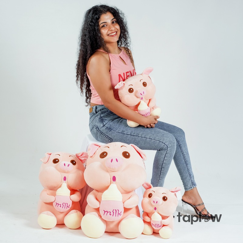Meet Milkie Piglet, the chubbiest little cuddle buddy with the biggest love for milk! Standing at 35 cm tall, this ultra-soft plush pig features a rosy pink body, chubby cheeks, and an adorable embroidered milk bottle. With its cute expression and squeezable body, Milkie Piglet is perfect for snuggles, gifting, or adding charm to any plush collection. Whether for a child or a collector, this lovable piglet is full of warmth, fun, and hug gable joy.