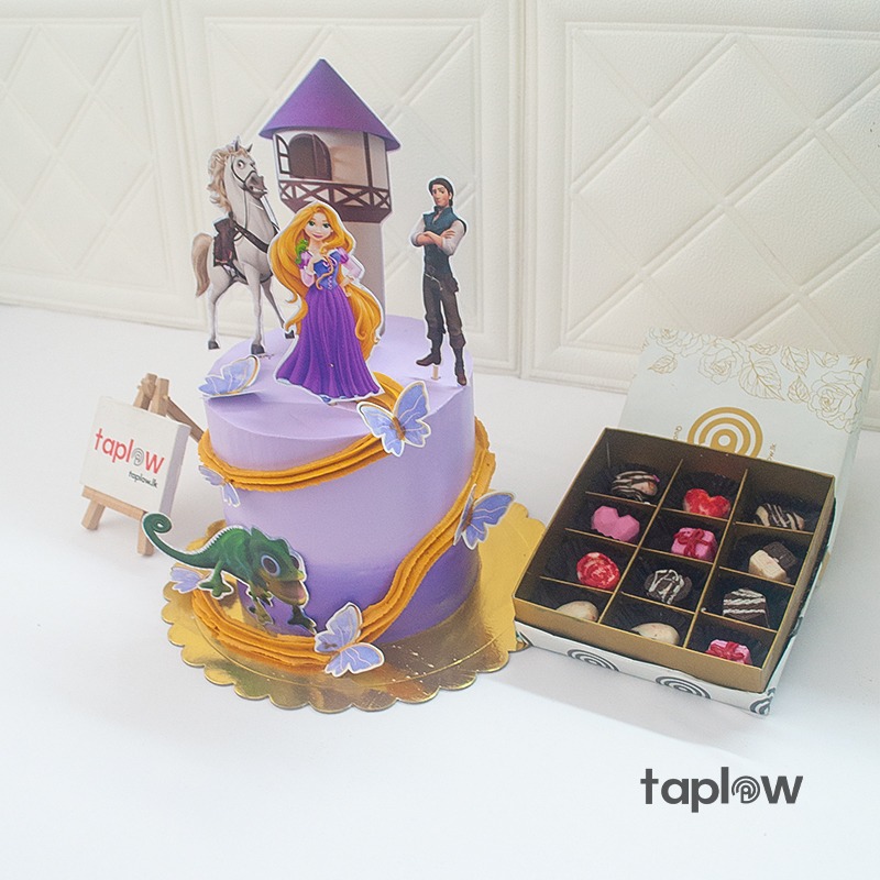 The Rapunzel’s Dream Gift Set features a magical Rapunzel-themed cake, adorned with enchanting details and fairytale charm, paired with smooth Swiss praline chocolates. A whimsical treat for celebrating with a touch of magic. This cake can be customized with a personalized icing message at no extra charge.