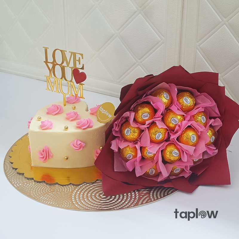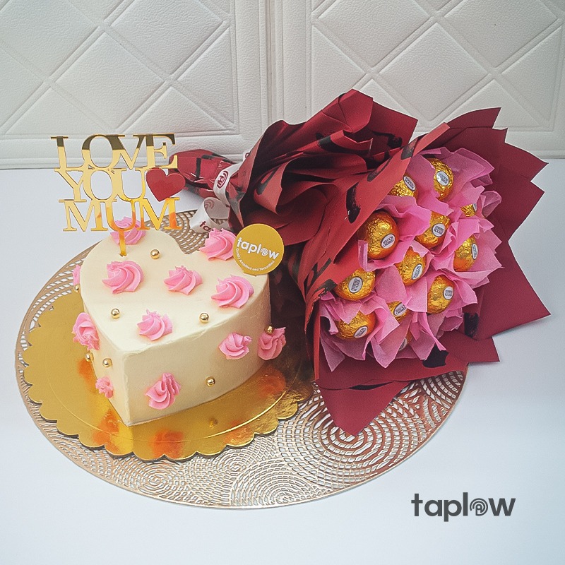 Make her heart melt with the perfect blend of sweetness and charm. The Scarlet Heart Surprise features a beautifully crafted Pretty Heart Cake, paired with a luxurious Ferraro R ocher bouquet wrapped in rich scarlet tones.