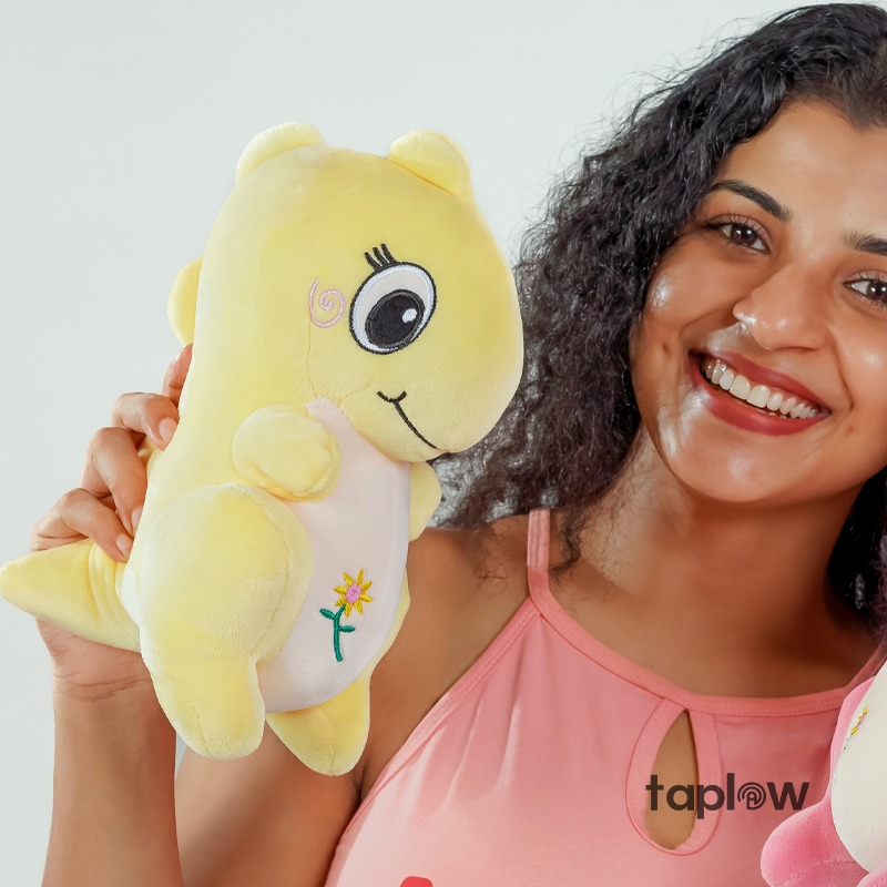 Meet Sunny Bloom Dino, your cheerful prehistoric pal in a bright yellow hue! Crafted with high-quality, ultra-soft material, this adorable baby dino features delicately embroidered eyes and a sweet smile that radiates warmth. A charming embroidered blooming flower on its side adds a playful, gentle touch. Perfect for cuddles, gifting, or brightening up any space with a dose of Dino joy.
