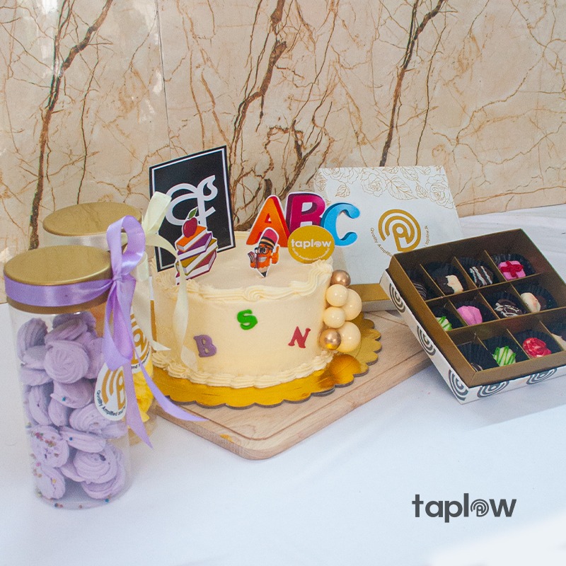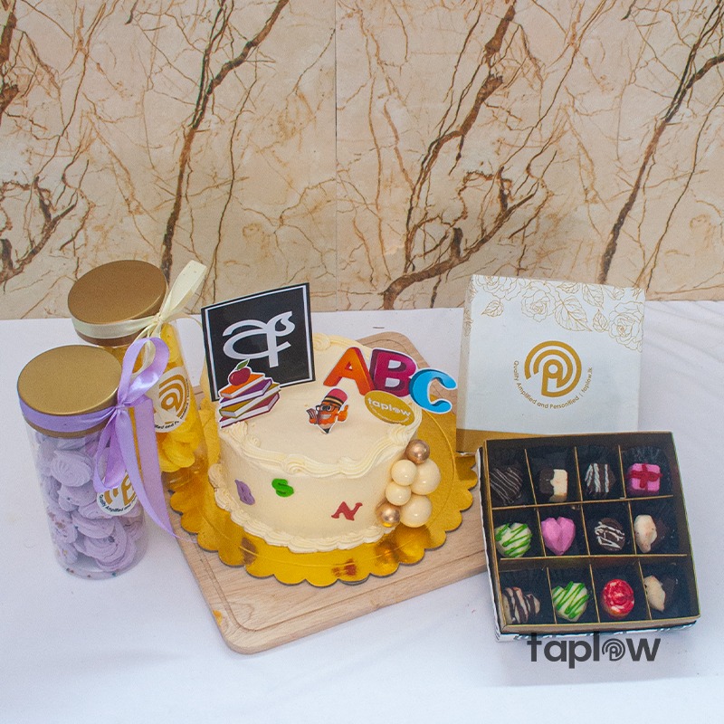 The Sweet ABC Surprise Set features a fun and colorful cake decorated with A, B, C accents and additional charming decorations that kids will love. It comes with Swiss Praline chocolates and Sprinkle kisses — the perfect treat for birthdays and sweet celebrations! This cake can be customized with a personalized icing message at no extra charge.