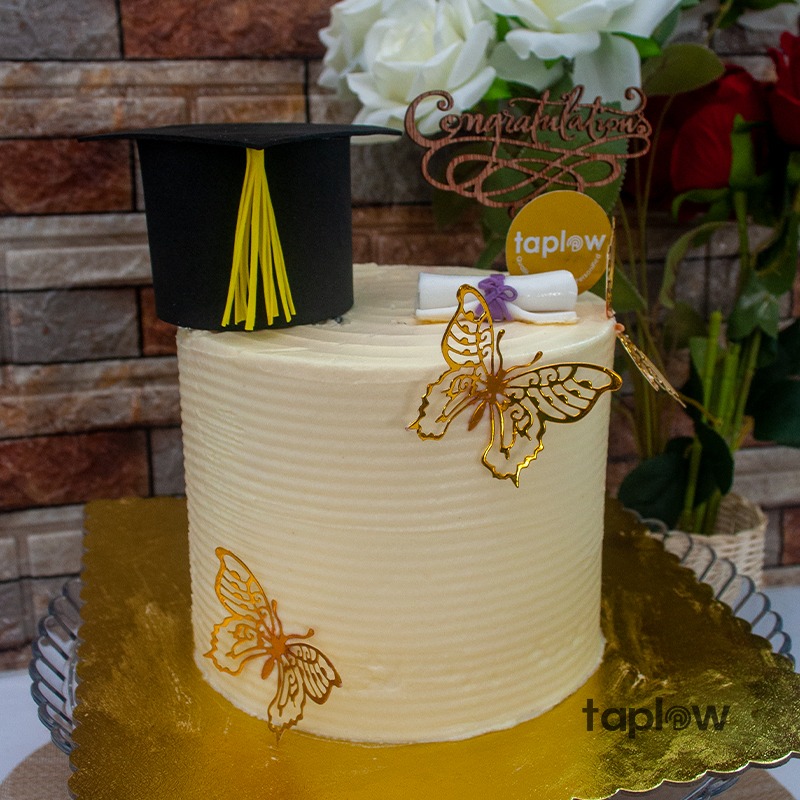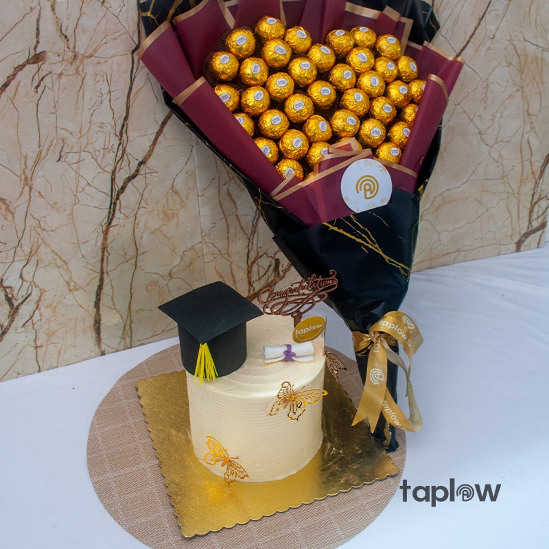 The Sweet Graduation Cheers Set features a delicious graduation-themed cake paired with a Ferrero chocolate bouquet — the perfect way to celebrate your grad’s success!  This cake can be customized with a personalized icing message at no extra charge.