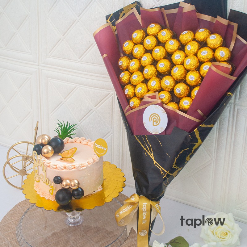 Celebrate love and indulgence with the Sweet Love & Chocolate Bliss Set. This romantic gift set includes a delectable cake and a luxurious Ferrero Rocher chocolate bouquet—perfect for sharing sweet moments with your special someone. This cake can be customized with a personalized icing message at no extra charge.