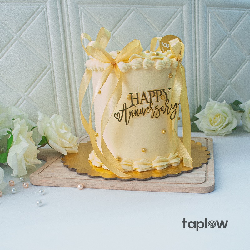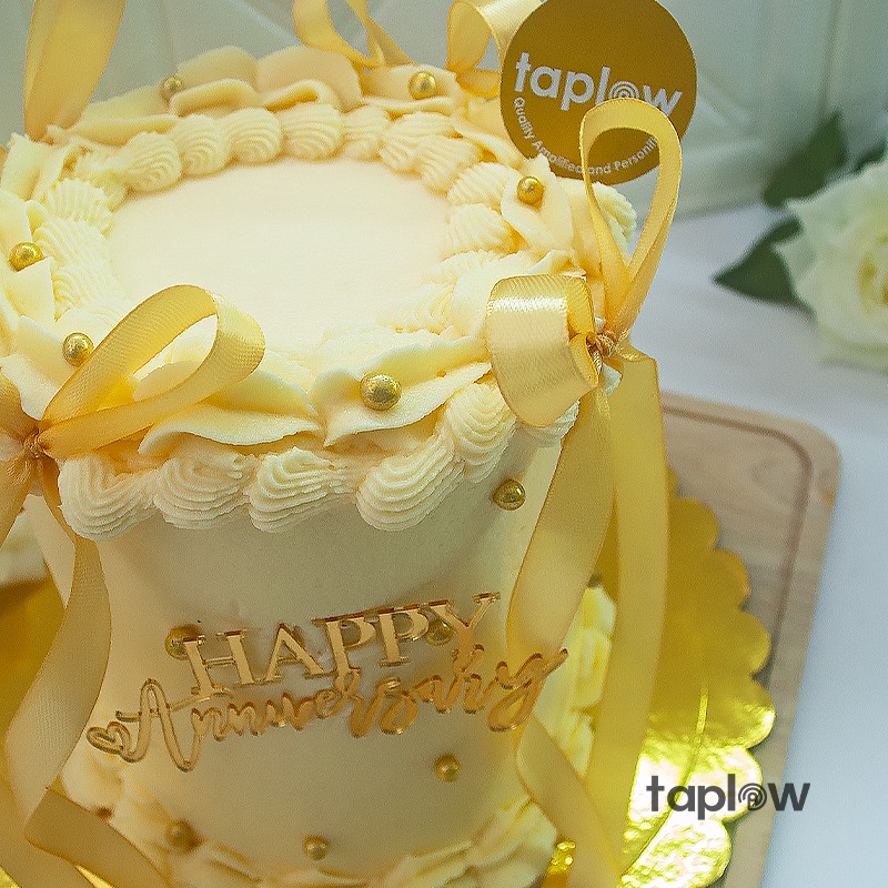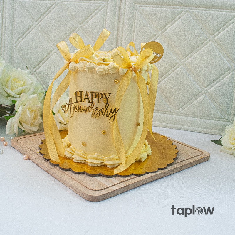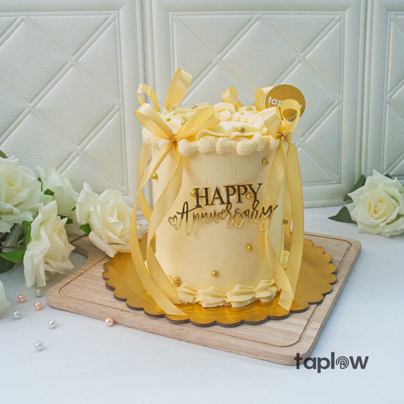 A dreamy buttercream cake adorned with gold pearls, a satin ribbon bow, and a “Happy Anniversary” topper, perfect for celebrating love, elegance, and lasting memories.