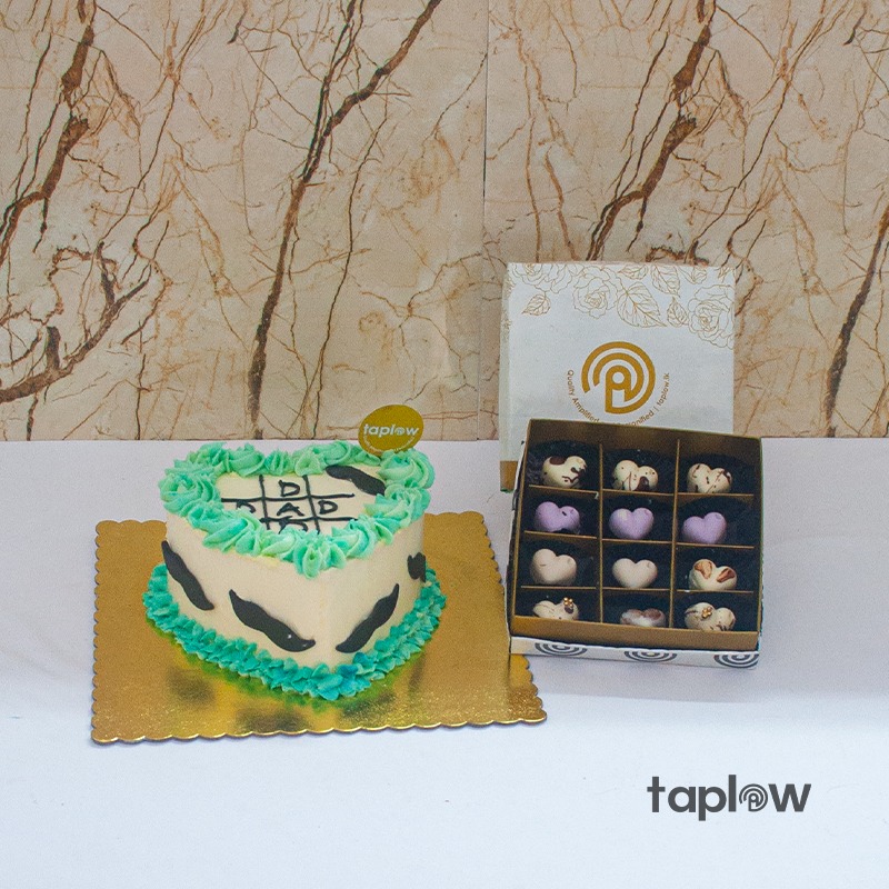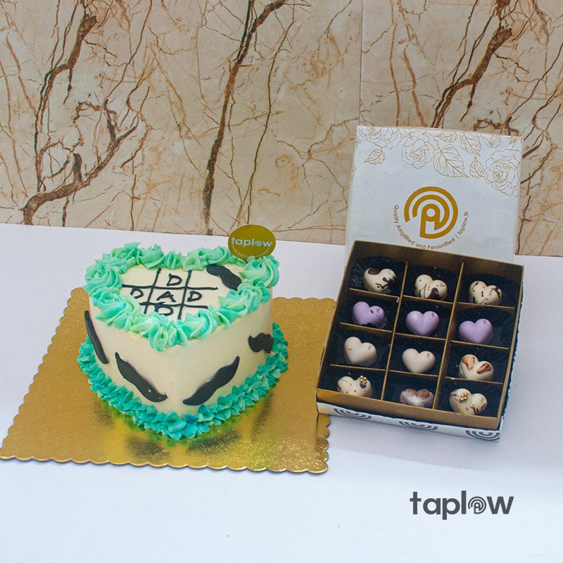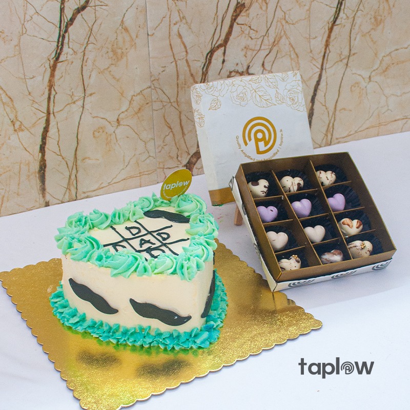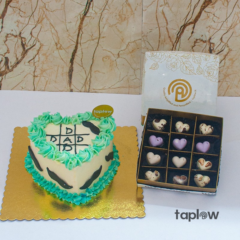 Celebrate the special man in your life with this heartwarming gift set. Featuring a heart-shaped cake with smooth cream icing, green decorative accents, and “Dad” written in black, paired with luxurious Swiss Praline Chocolates. A sweet way to show your love and appreciation.