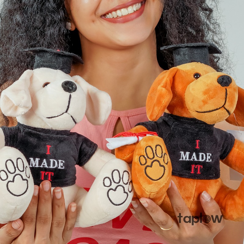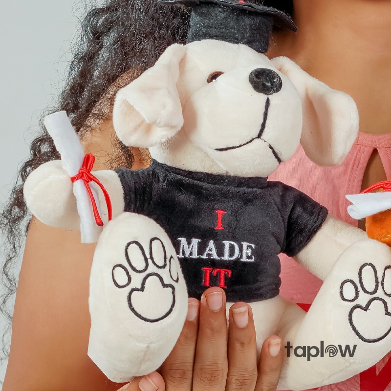 Celebrate success with White Grad Pup, an adorable off-white graduation dog plush dressed in a sleek black “I Made It” tee. This proud pup sports a classic graduation cap and holds a little certificate, making it the perfect keepsake for graduates of all ages. Soft, cuddly, and full of charm, White Grad Pup is ready to join in on every celebration and inspire new adventures ahead.